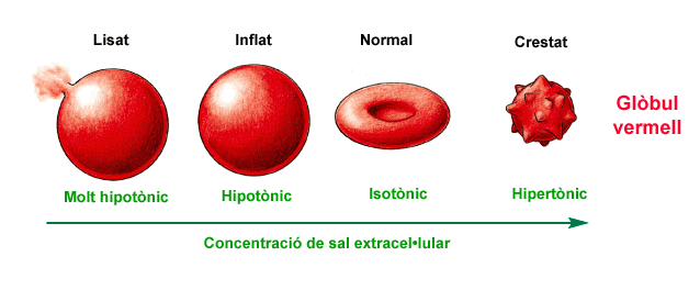 Els glòbuls vermells tenen un aspecte totalment arrodonit i alguns esclaten, en una solució que conté el 0,4 % de ClNa (Hipotònica)
